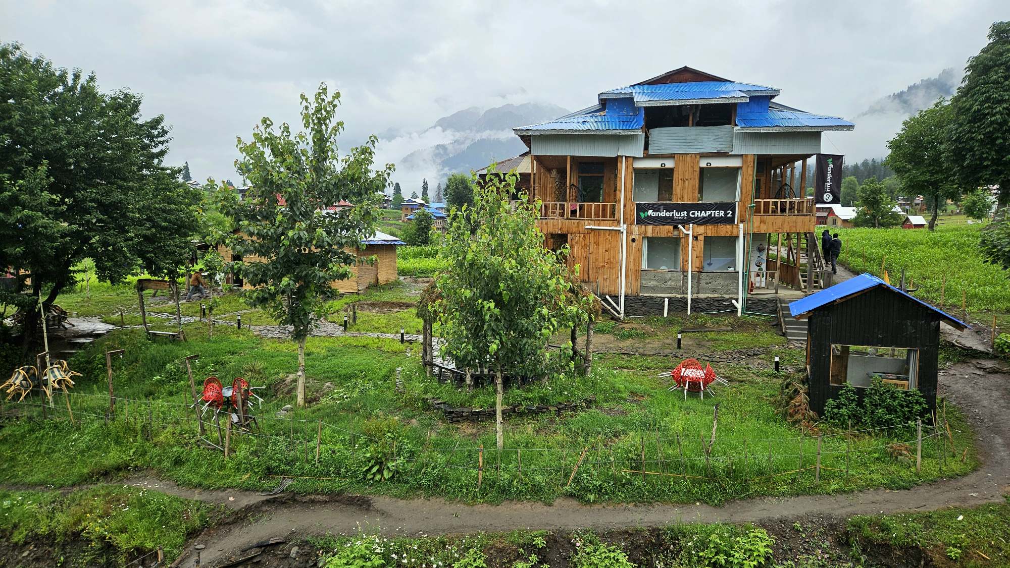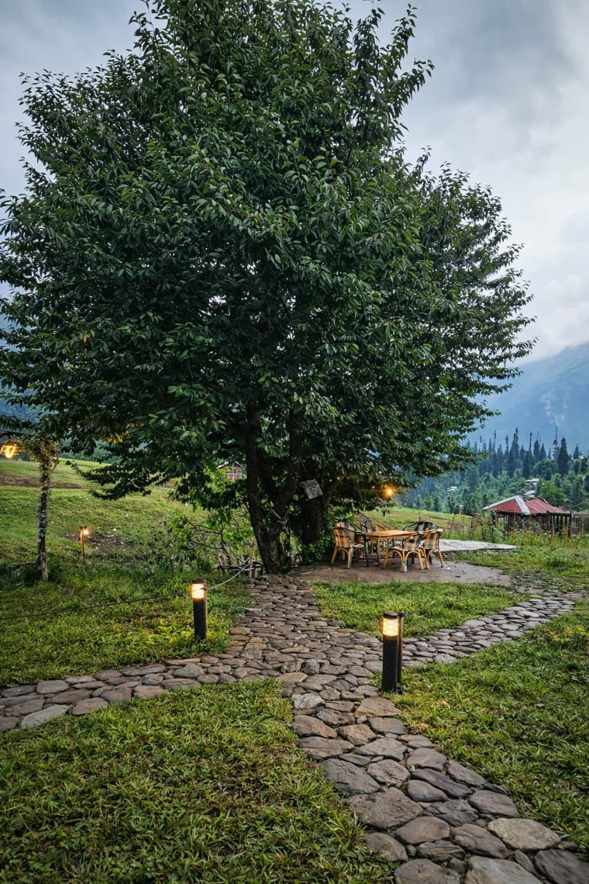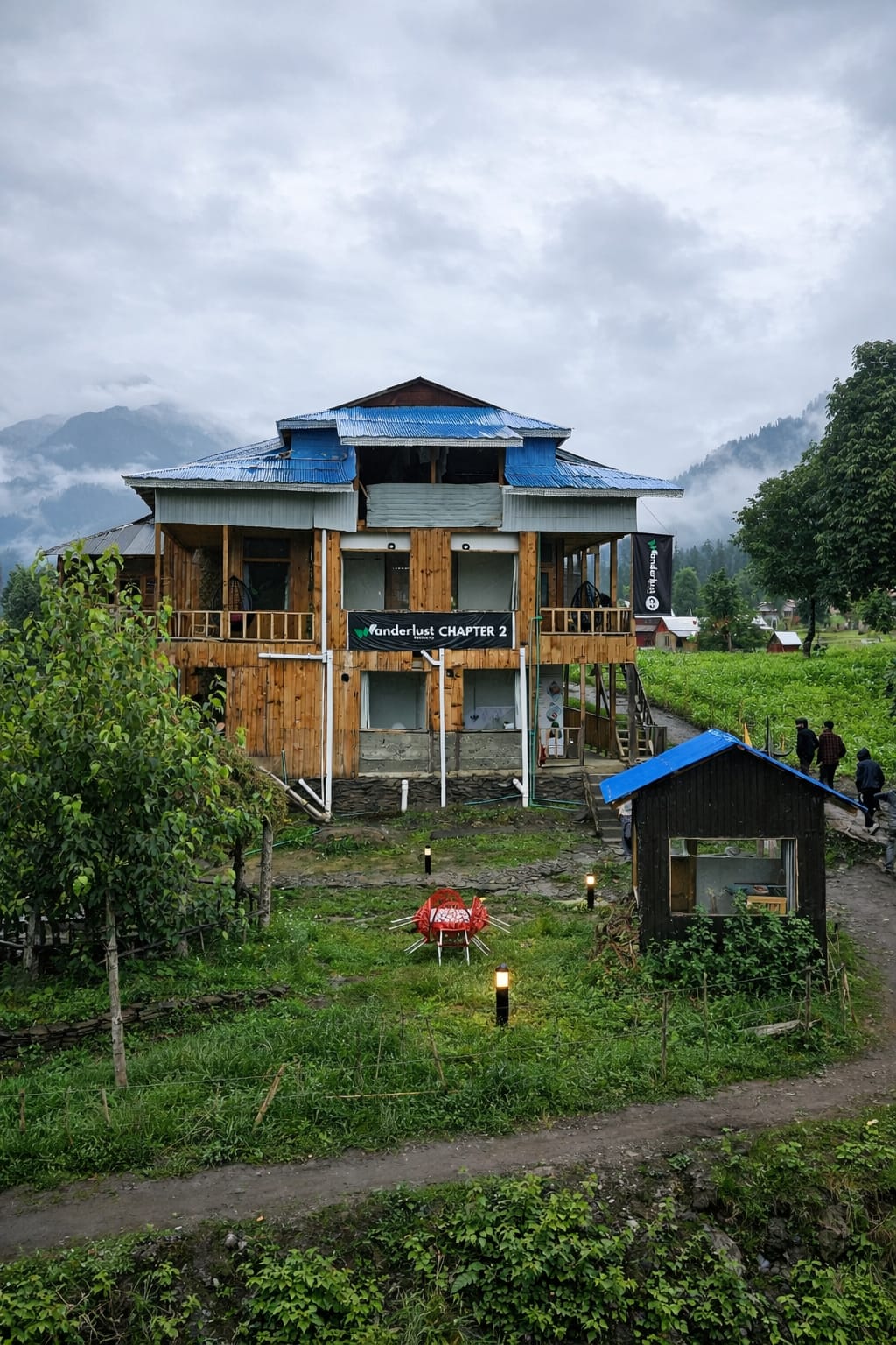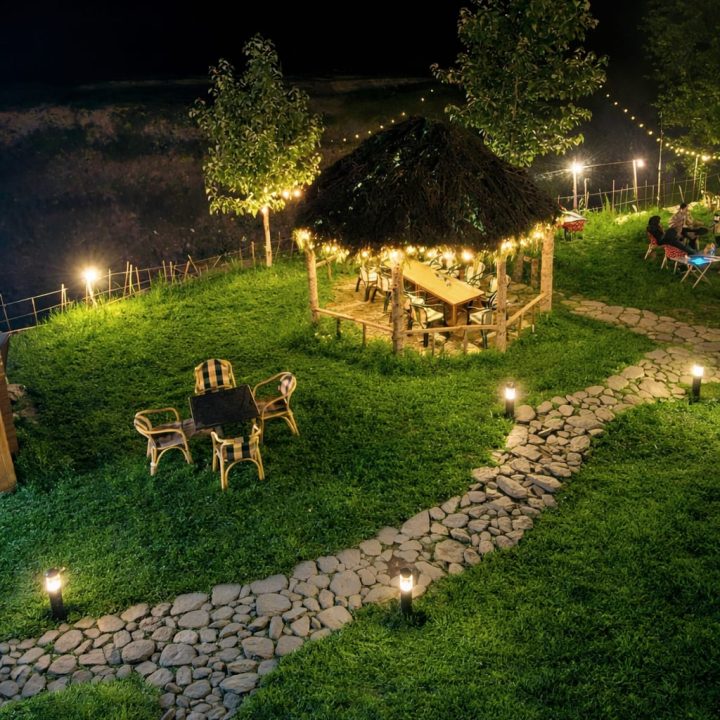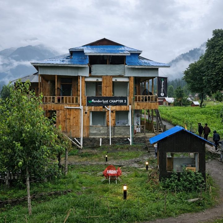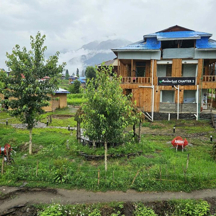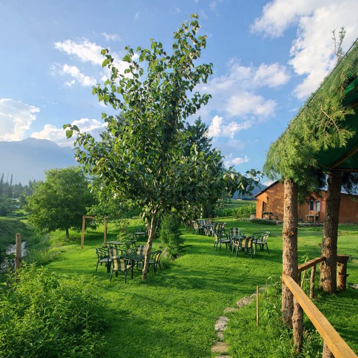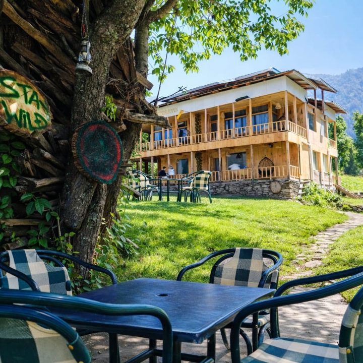 The Exterior of Chapter 2 at Wanderlust Resorts offers a tranquil retreat, surrounded by lush meadows and a flowing water stream. It features a furnished outdoor seating area and a Tree Café, where guests can enjoy Desi, Chinese, and fast food in a refreshing natural setting. With its wooden aesthetics and open-air ambiance, it’s the perfect spot to unwind with a warm cup of tea or savor a delightful meal while embracing the beauty of the mountains.