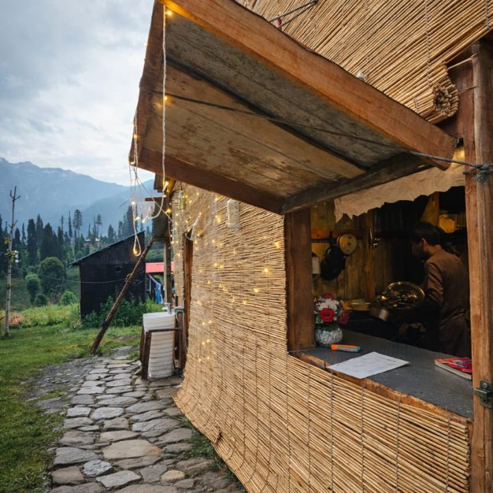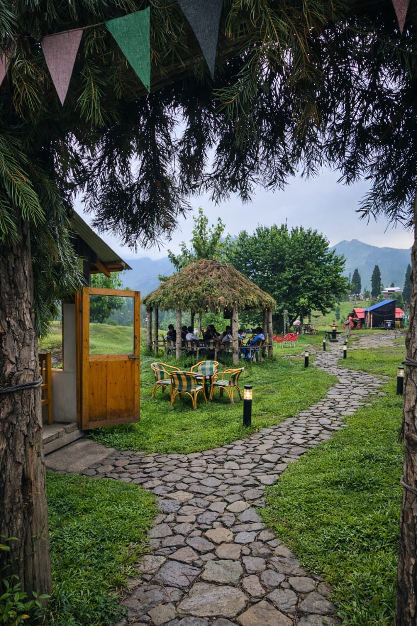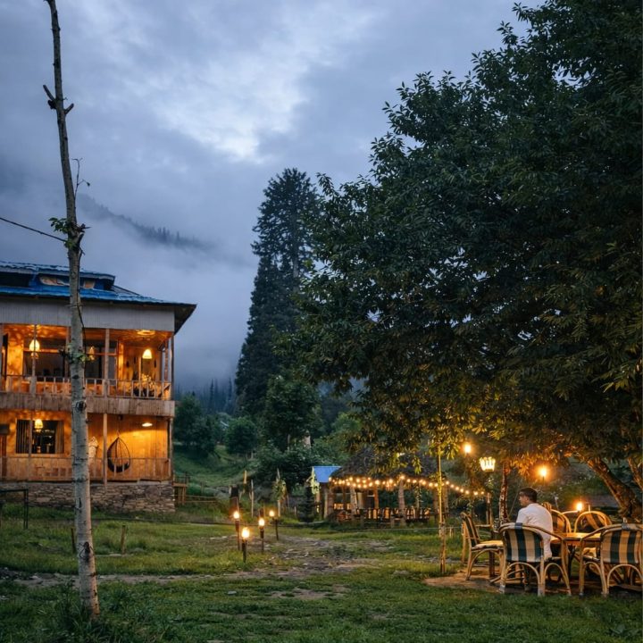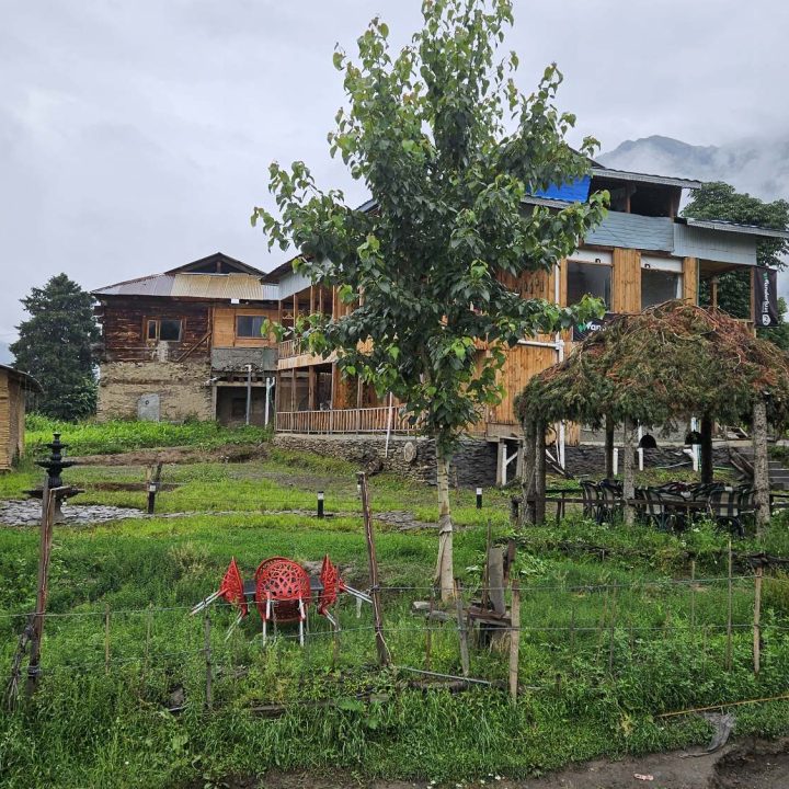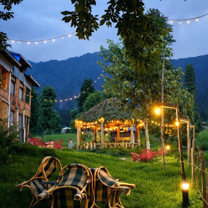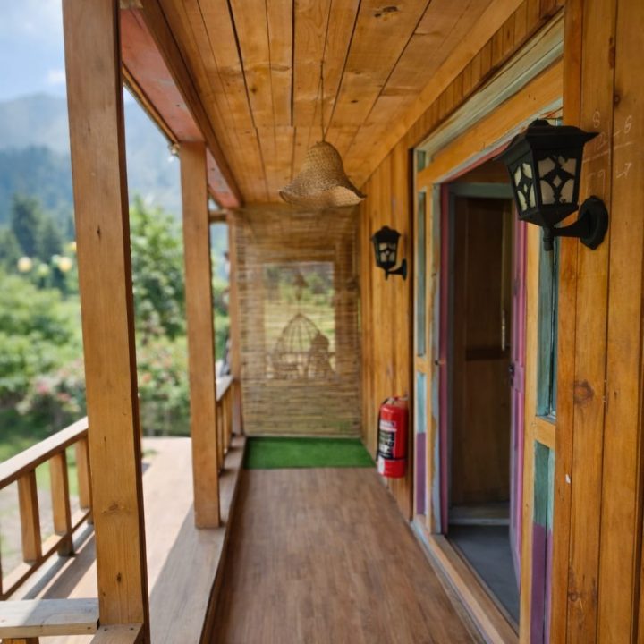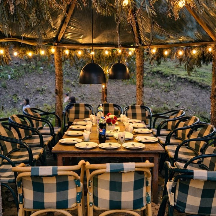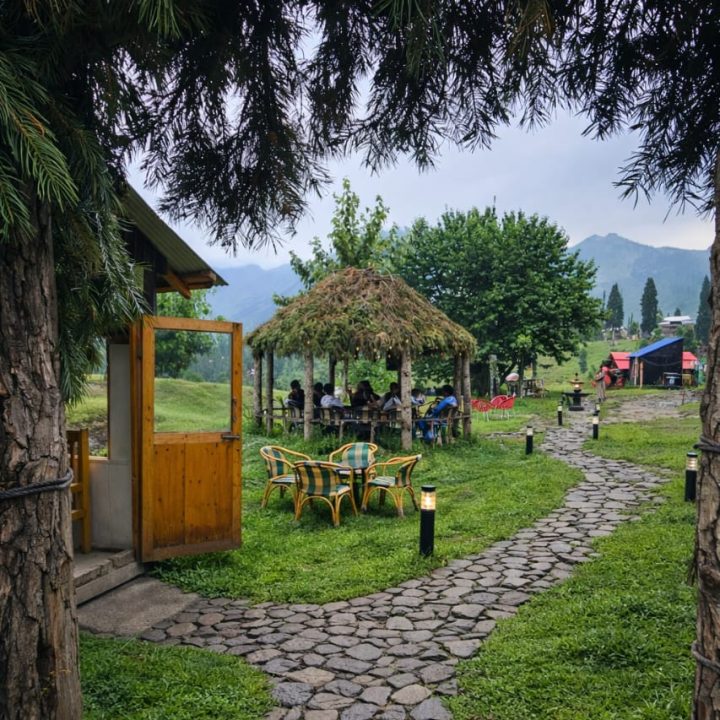 The Exterior of Chapter 2 at Wanderlust Resorts offers a tranquil retreat, surrounded by lush meadows and a flowing water stream. It features a furnished outdoor seating area and a Tree Café, where guests can enjoy Desi, Chinese, and fast food in a refreshing natural setting. With its wooden aesthetics and open-air ambiance, it’s the perfect spot to unwind with a warm cup of tea or savor a delightful meal while embracing the beauty of the mountains.