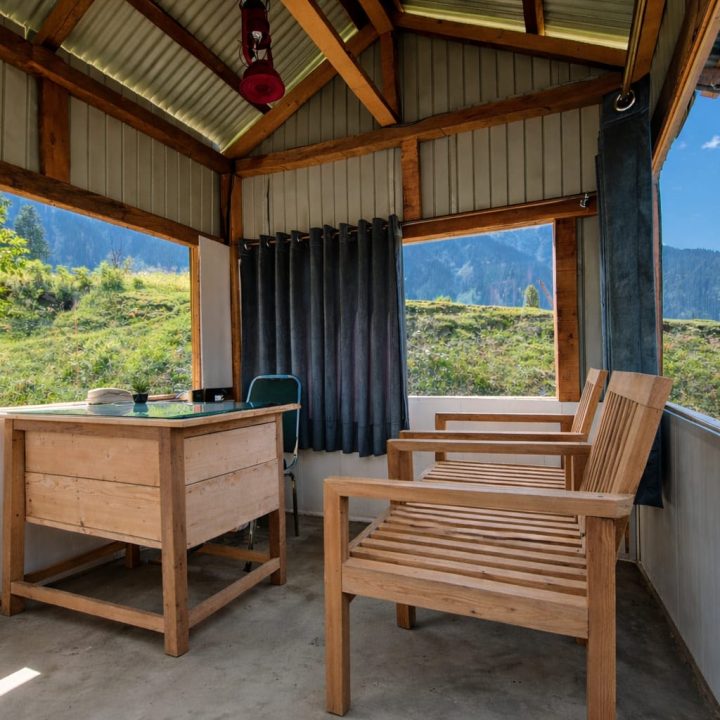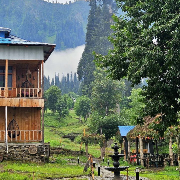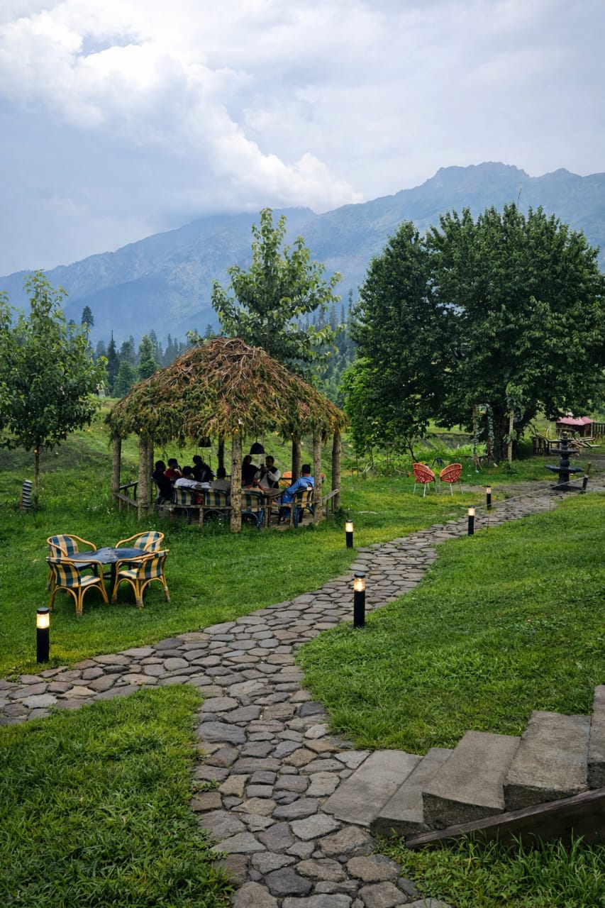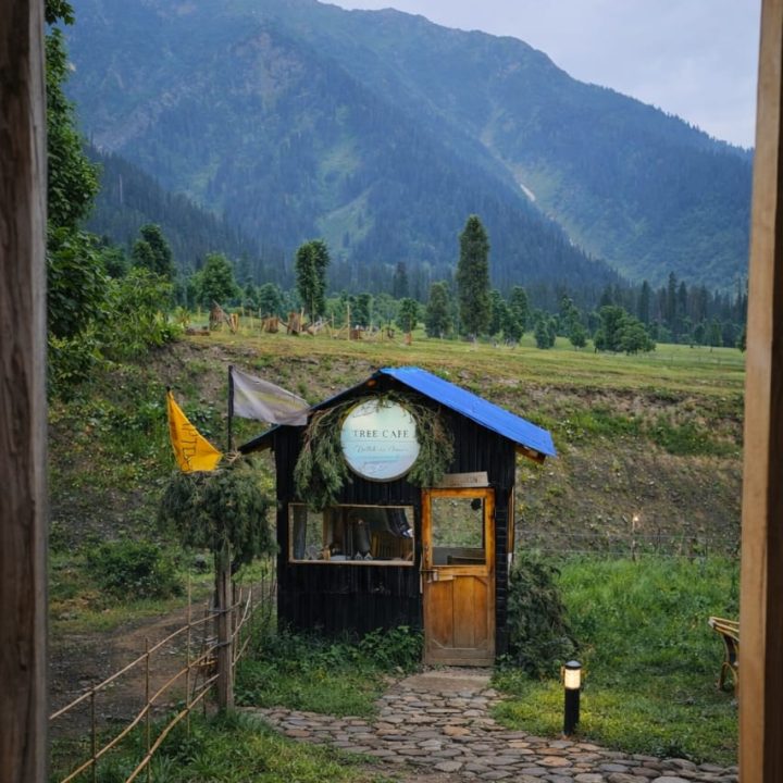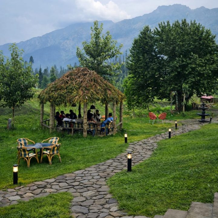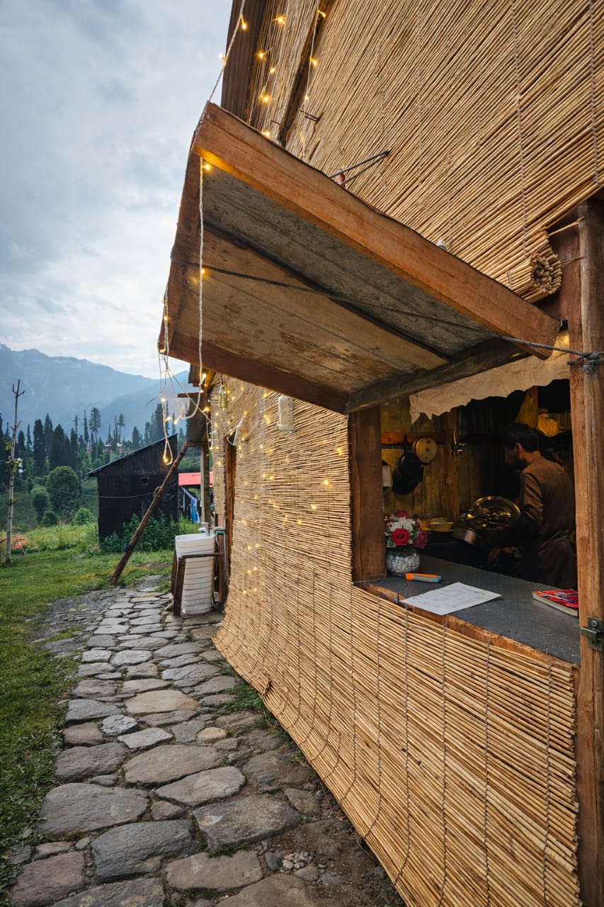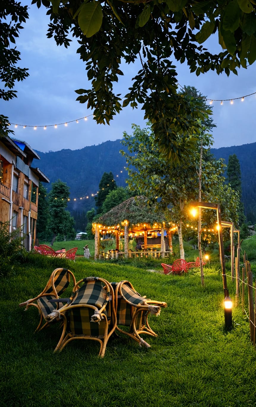 The Exterior of Chapter 2 at Wanderlust Resorts offers a tranquil retreat, surrounded by lush meadows and a flowing water stream. It features a furnished outdoor seating area and a Tree Café, where guests can enjoy Desi, Chinese, and fast food in a refreshing natural setting. With its wooden aesthetics and open-air ambiance, it’s the perfect spot to unwind with a warm cup of tea or savor a delightful meal while embracing the beauty of the mountains.