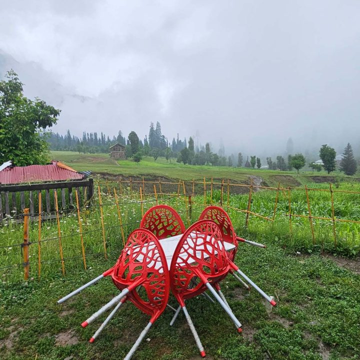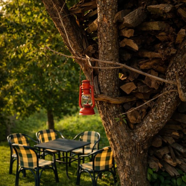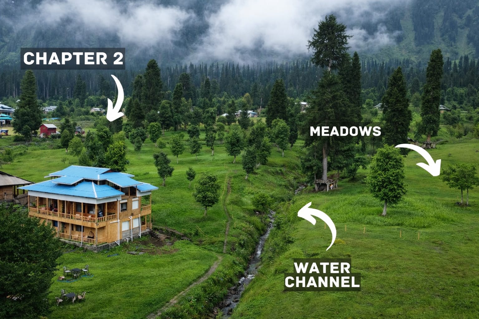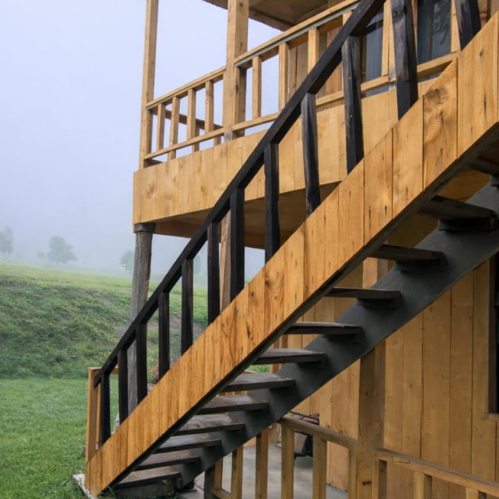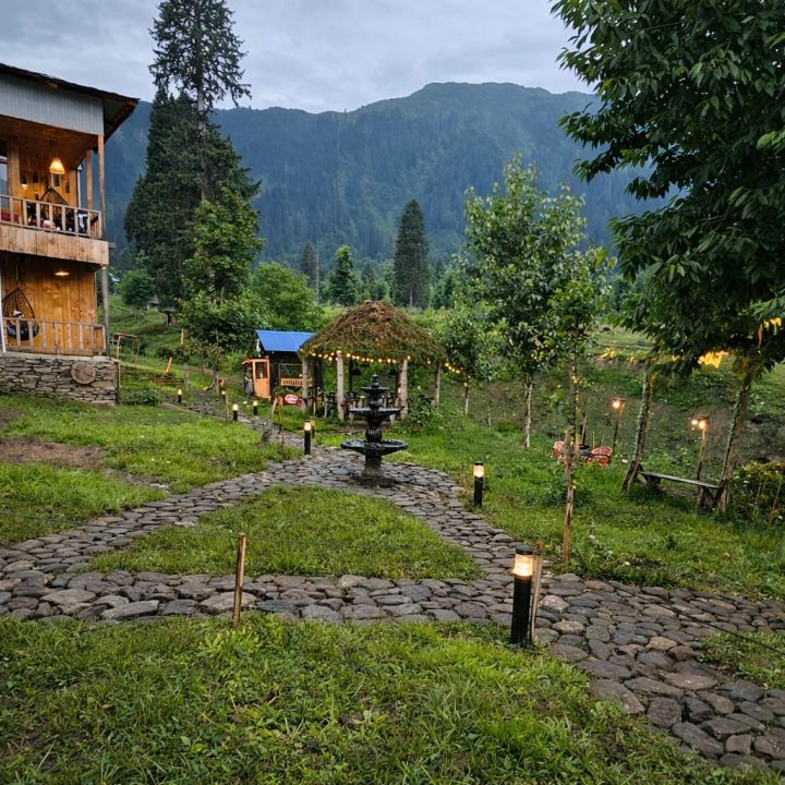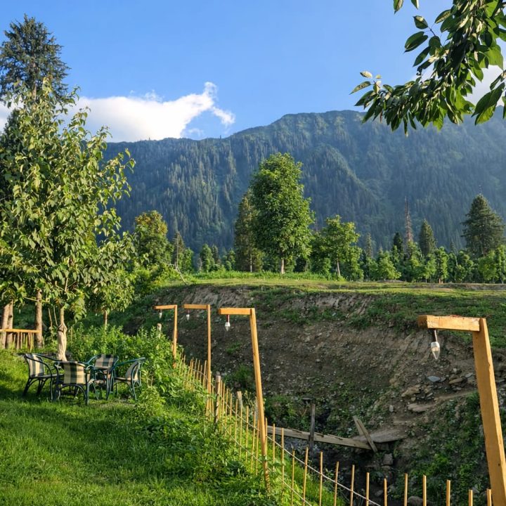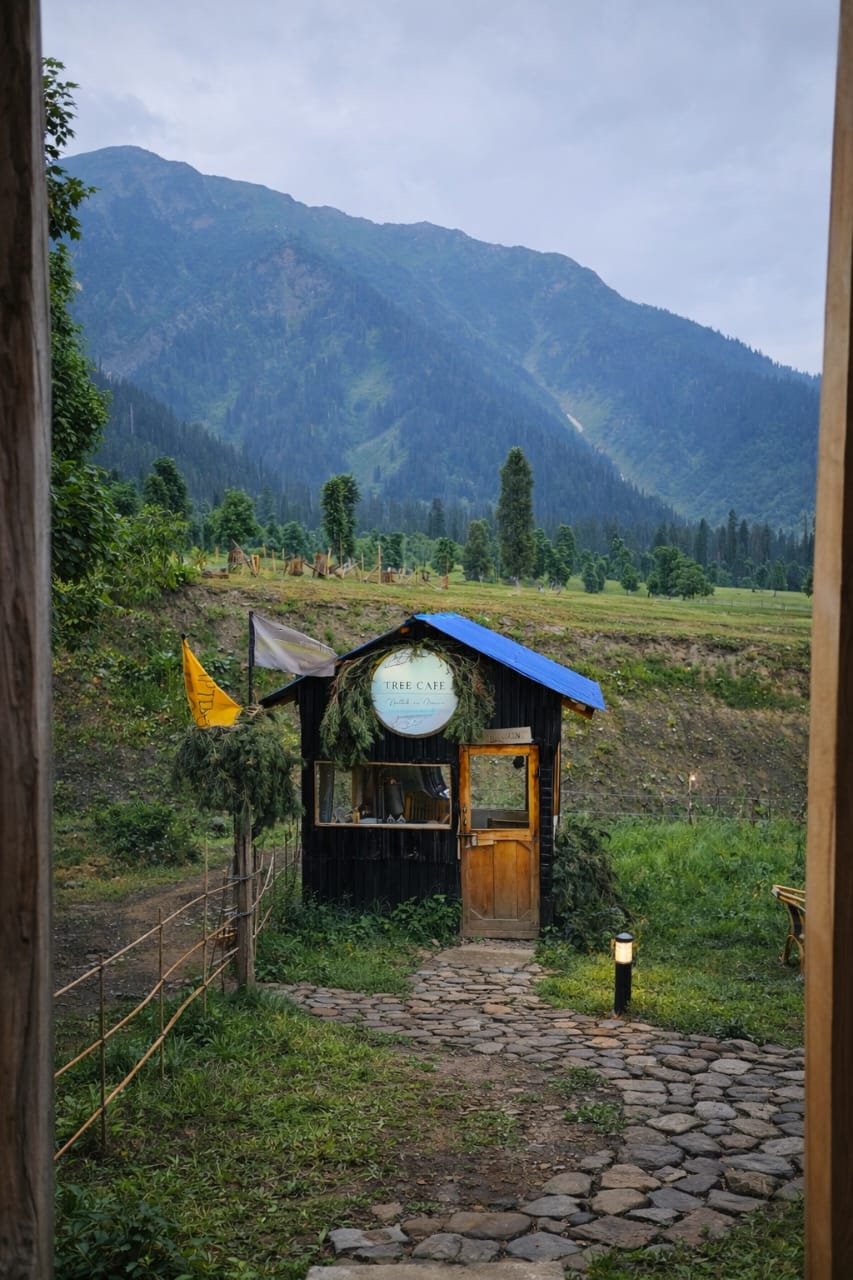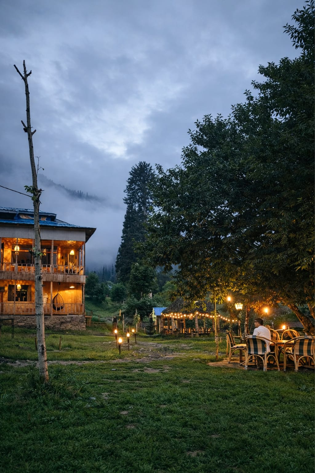 The Exterior of Chapter 2 at Wanderlust Resorts offers a tranquil retreat, surrounded by lush meadows and a flowing water stream. It features a furnished outdoor seating area and a Tree Café, where guests can enjoy Desi, Chinese, and fast food in a refreshing natural setting. With its wooden aesthetics and open-air ambiance, it’s the perfect spot to unwind with a warm cup of tea or savor a delightful meal while embracing the beauty of the mountains.