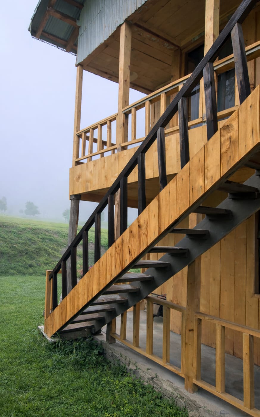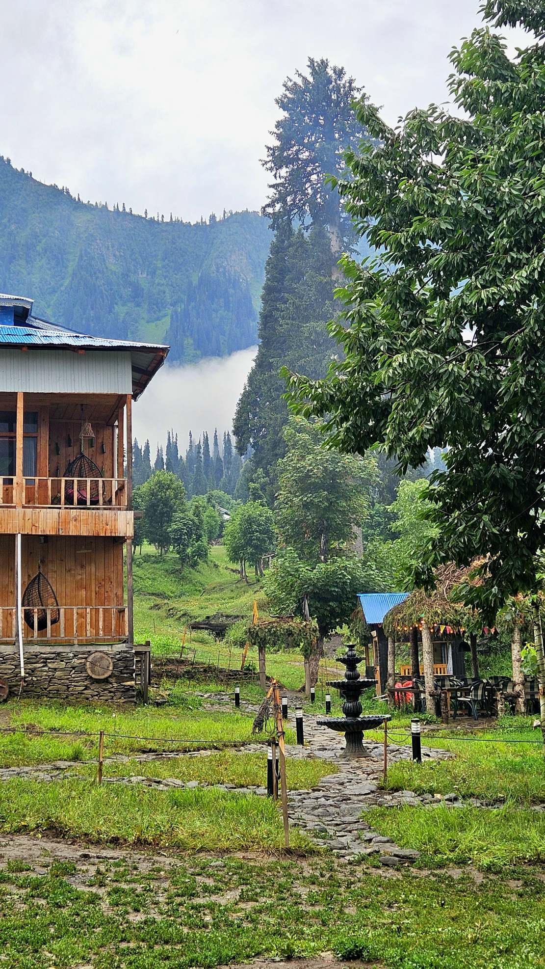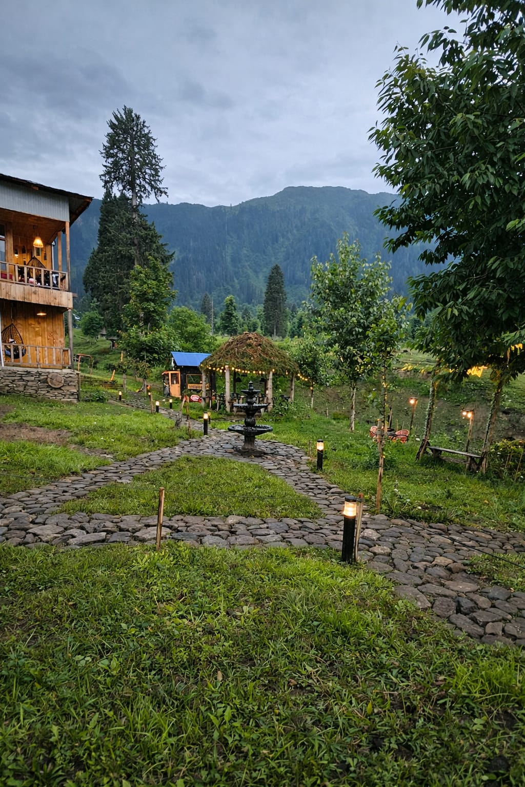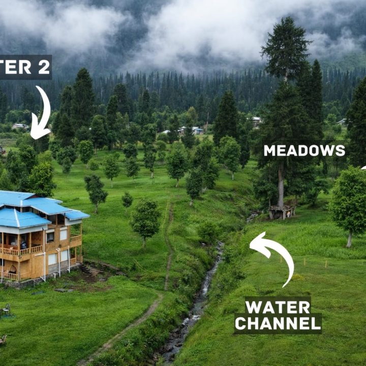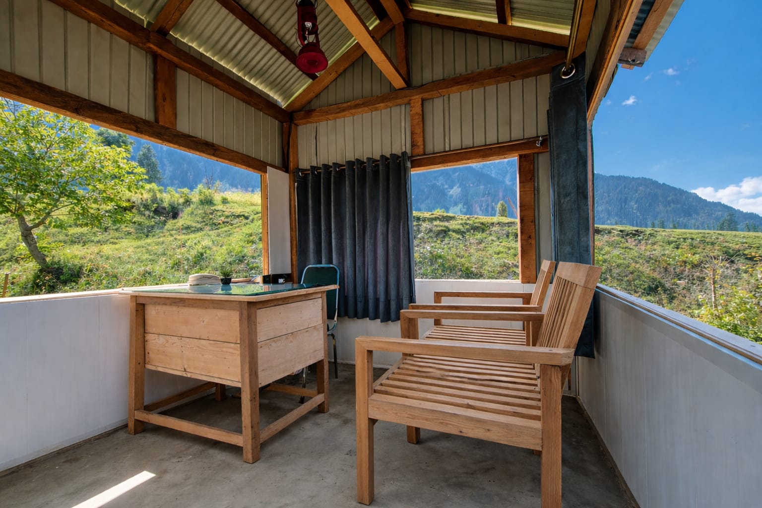 The Exterior of Chapter 2 at Wanderlust Resorts offers a tranquil retreat, surrounded by lush meadows and a flowing water stream. It features a furnished outdoor seating area and a Tree Café, where guests can enjoy Desi, Chinese, and fast food in a refreshing natural setting. With its wooden aesthetics and open-air ambiance, it’s the perfect spot to unwind with a warm cup of tea or savor a delightful meal while embracing the beauty of the mountains.