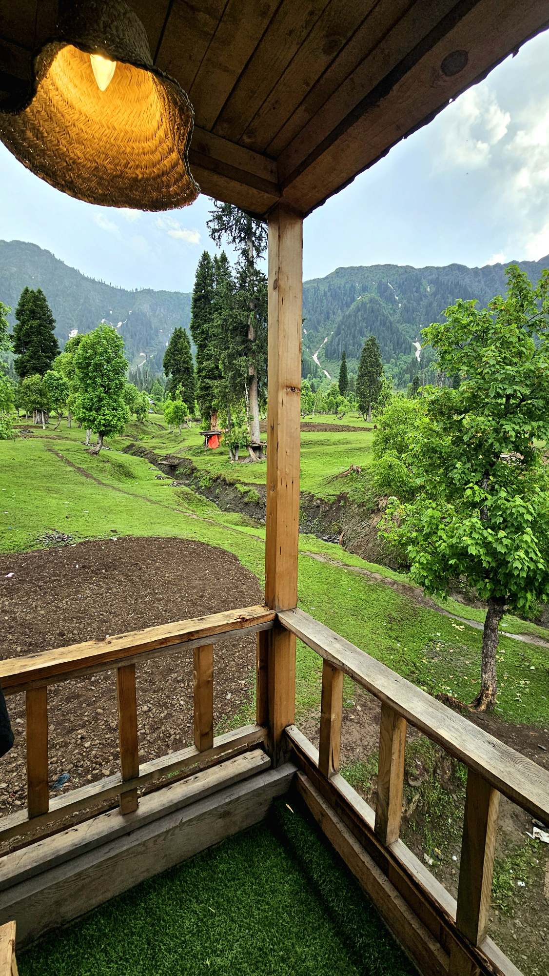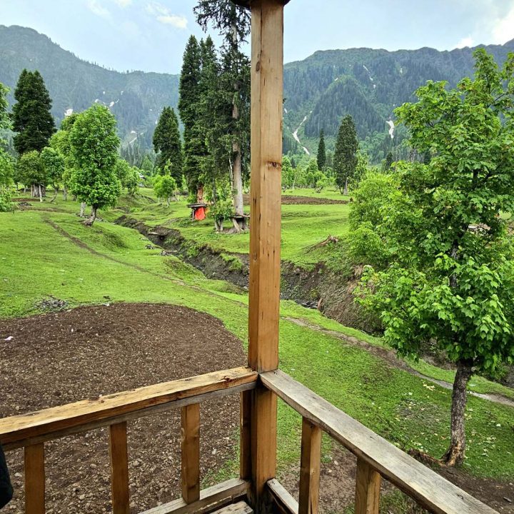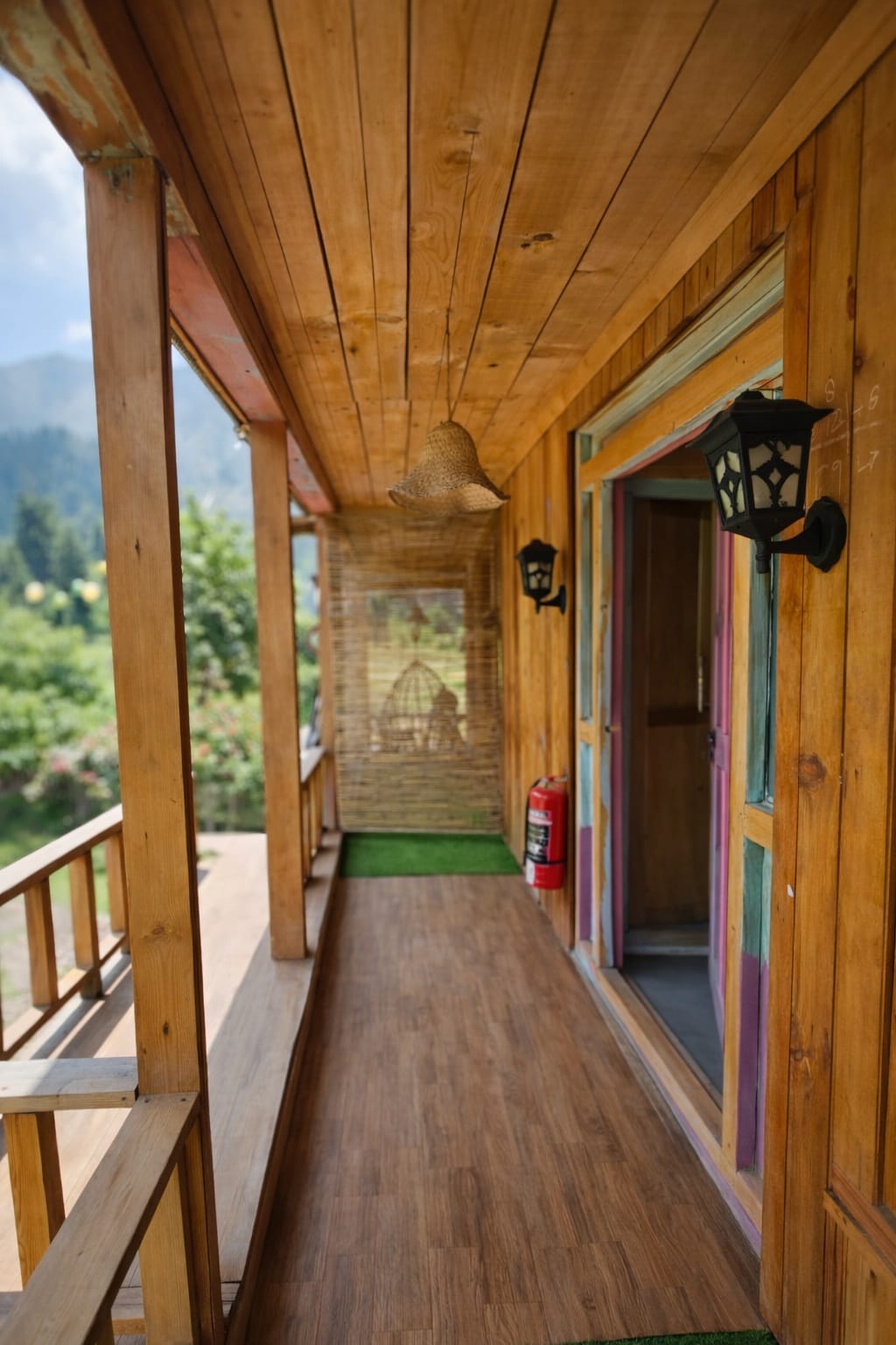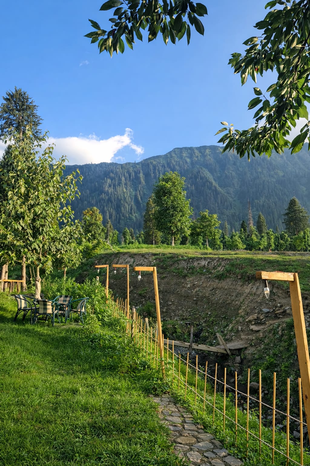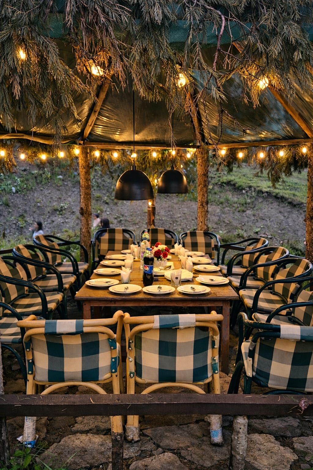 The Exterior of Chapter 2 at Wanderlust Resorts offers a tranquil retreat, surrounded by lush meadows and a flowing water stream. It features a furnished outdoor seating area and a Tree Café, where guests can enjoy Desi, Chinese, and fast food in a refreshing natural setting. With its wooden aesthetics and open-air ambiance, it’s the perfect spot to unwind with a warm cup of tea or savor a delightful meal while embracing the beauty of the mountains.
