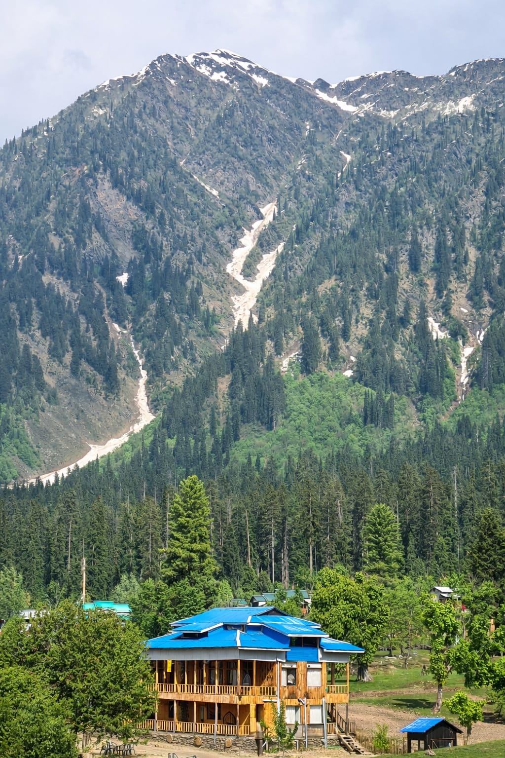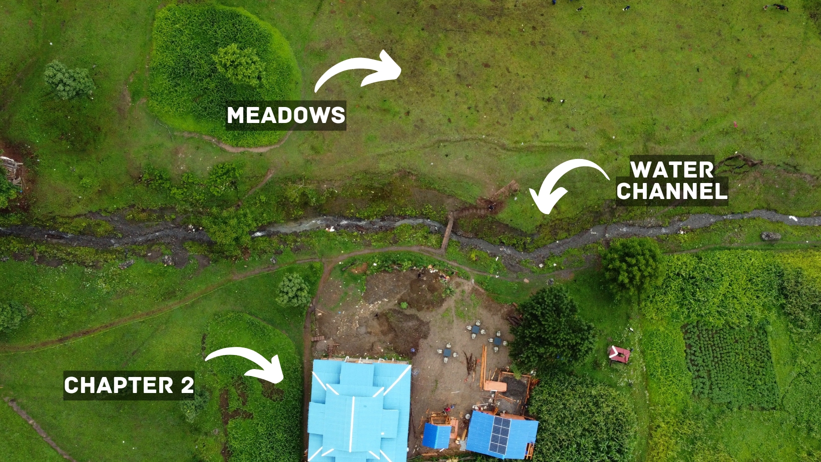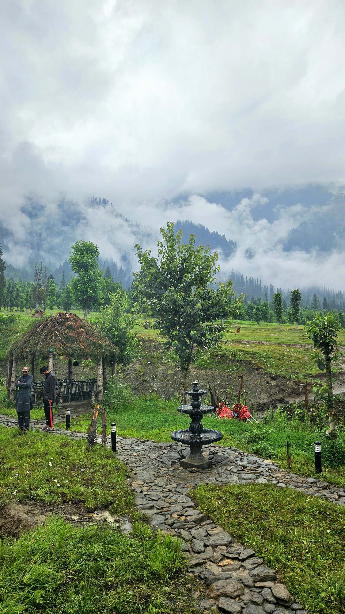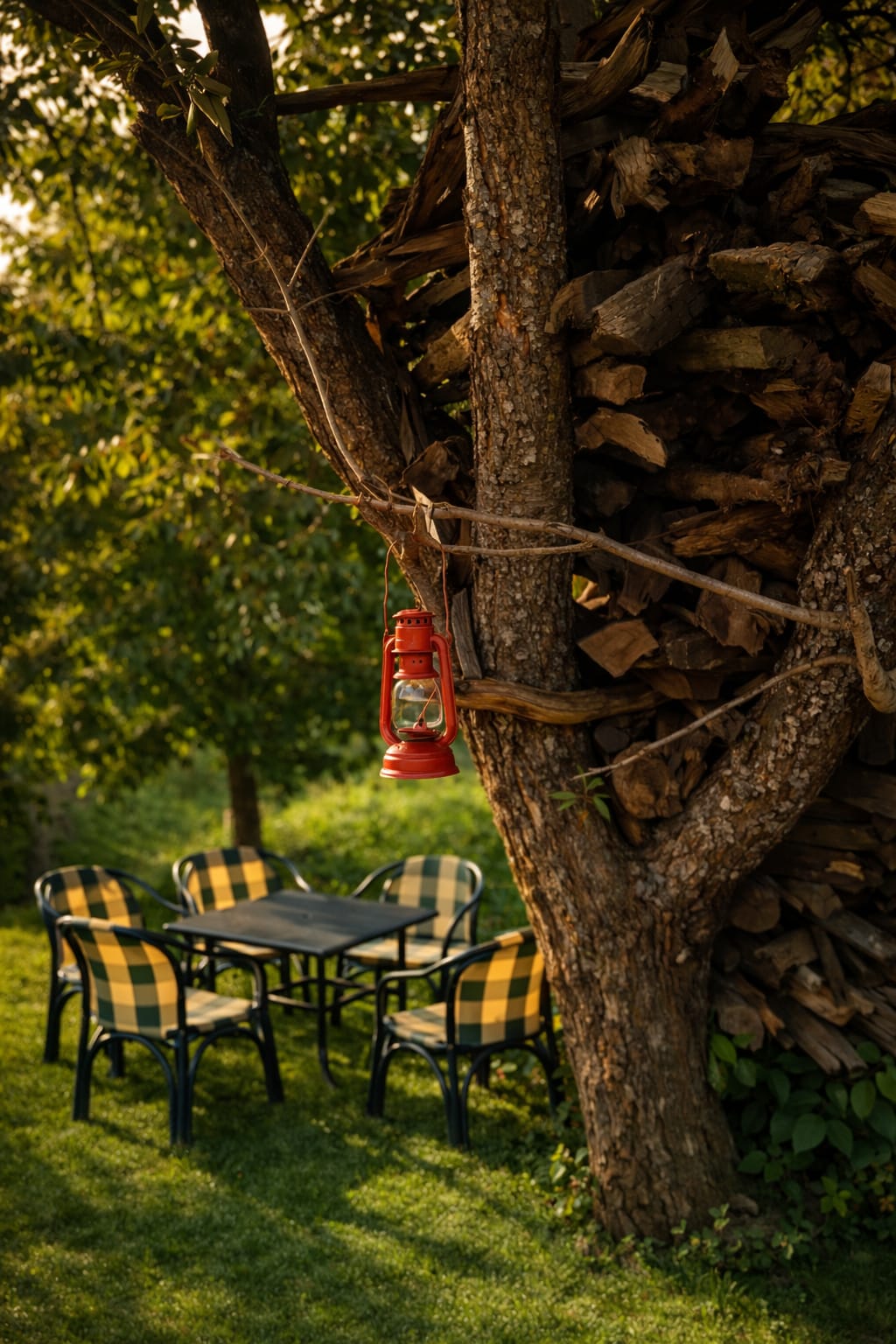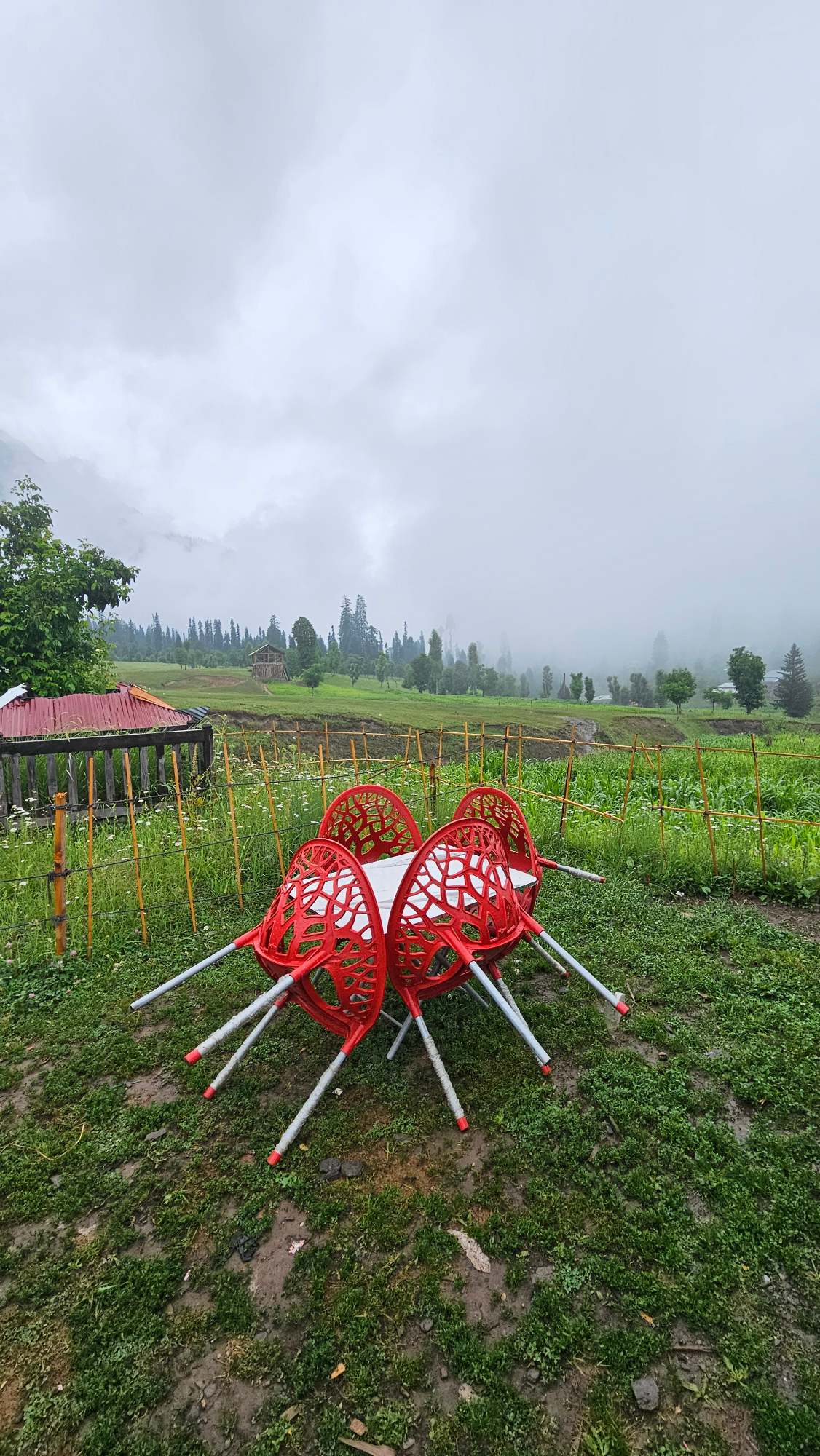 The Exterior of Chapter 2 at Wanderlust Resorts offers a tranquil retreat, surrounded by lush meadows and a flowing water stream. It features a furnished outdoor seating area and a Tree Café, where guests can enjoy Desi, Chinese, and fast food in a refreshing natural setting. With its wooden aesthetics and open-air ambiance, it’s the perfect spot to unwind with a warm cup of tea or savor a delightful meal while embracing the beauty of the mountains.